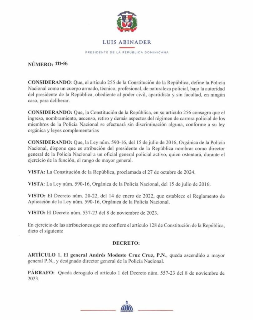 Santo Domingo.– En un movimiento estratégico dentro del tren gubernamental, el presidente Luis Abinader designó al general Andrés Modesto Cruz Cruz como el nuevo director general de la Policía Nacional, promoviéndolo simultáneamente al rango de mayor general. La decisión, contenida en el Decreto núm. 111-26, busca fortalecer la supervisión y gestión interna de la institución del orden.