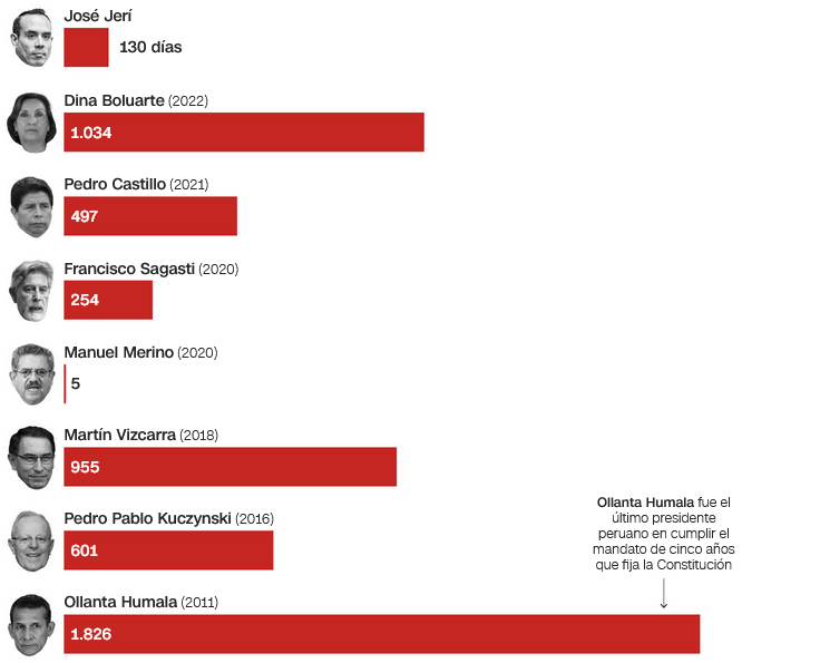 El último presidente de Perú que completó su mandato fue Ollanta Humala (2011-2016). Luego, Pedro Pablo Kuczynski renunció en 2018 antes de una votación del Congreso; su vicepresidente, Martín Vizcarra, fue destituido en 2020; Manuel Merino asumió como presidente del Congreso pero duró cinco días en el cargo; y Francisco Sagasti completó el período. Posteriormente, Pedro Castillo asumió tras ganar las elecciones de 2021, antes de ser sucedido por Boluarte y Jerí.