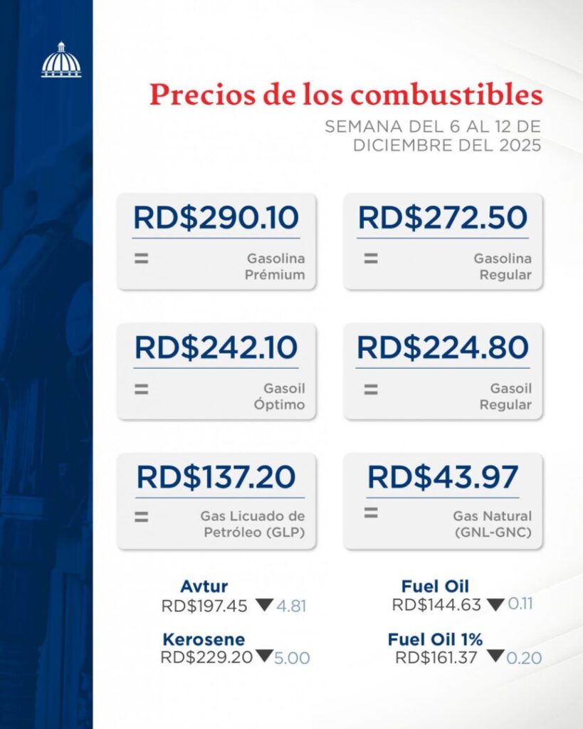 Santo Domingo – El Gobierno anunció que los precios de los combustibles de uso masivo se mantendrán sin variación durante la semana del 6 de diciembre al 12 de diciembre de 2025.
