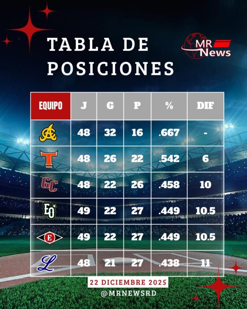 ¡La pelota invernal dominicana está que arde! Tienes toda la razón, la tabla de la LIDOM está en un punto de máxima tensión. Con solo dos fechas restantes (hoy 22 y mañana 23 de diciembre) para cerrar la serie regular, la lucha por los últimos dos boletos al Round Robin es una verdadera guerra.